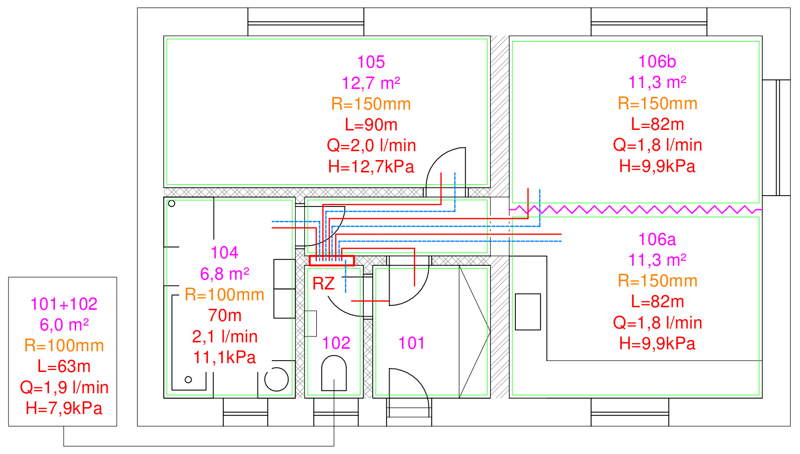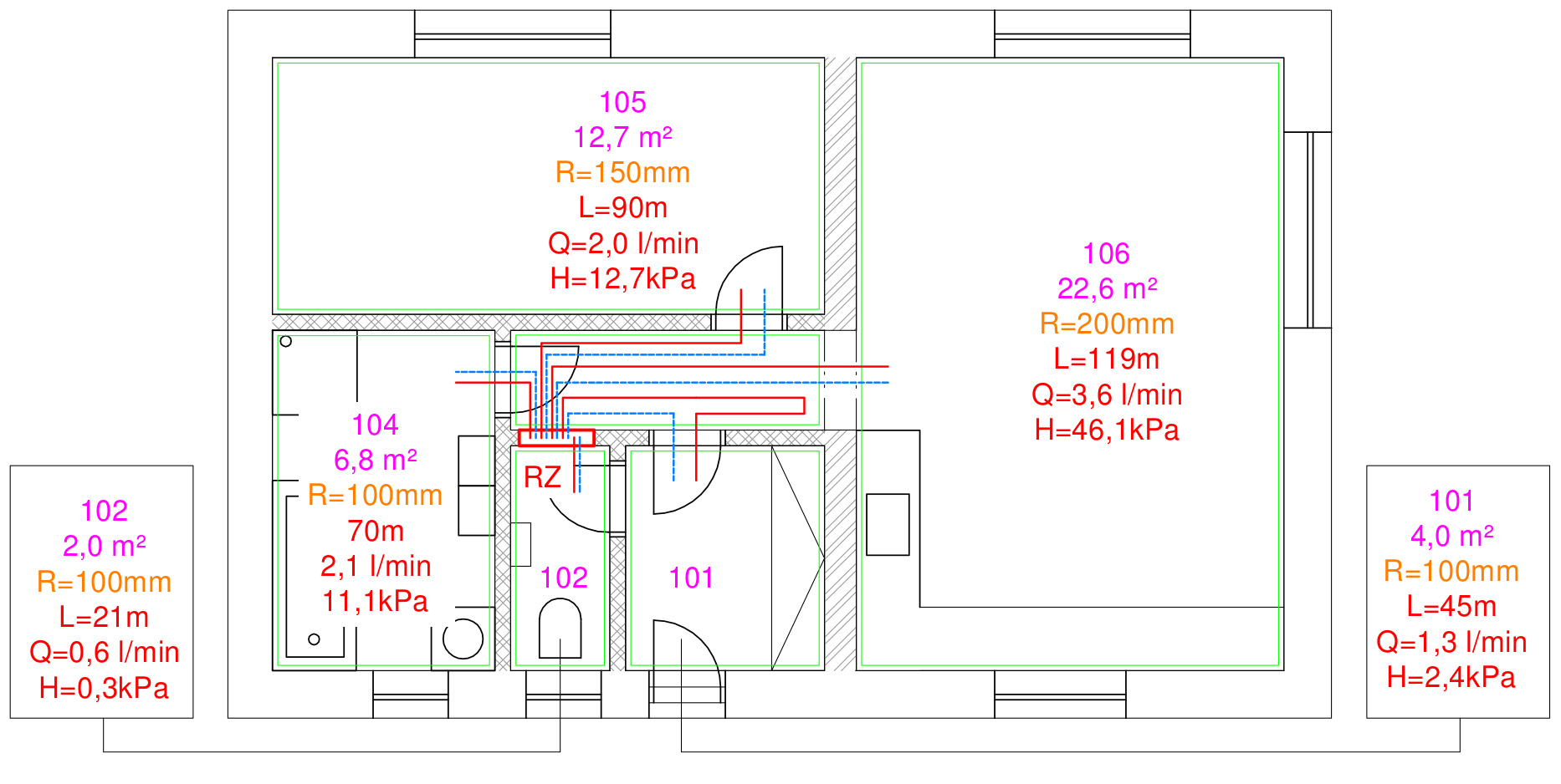 Hmotnostný prietok cez okruh v miestnosti č. 106 je 216 kg/h (3,6 l/min) a ak uzatvárací zvršok v rozdeľovači ostane plne otvorený, jeho tlaková strata bude 1,5 kPa.